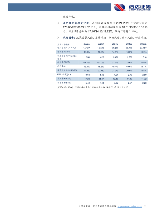 盈利预测与投资评级:我们预计太极集团2024-2026年营收分别为178.88/207.88/241.57亿元,归母净利润分别为10.81/13.36/16.10亿元,对应PE分别为17.46/14.13/11.72X,维持“增持”评级。