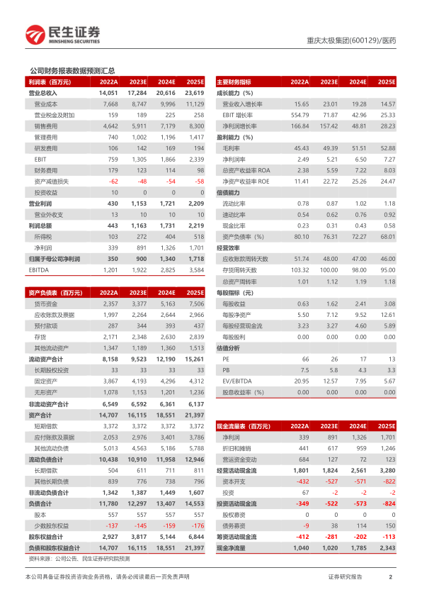 民生证券维持对太极集团的“推荐”评级。预计2023-2025年归母净利润分别为9亿元、13亿元和17亿元,对应的PE分别为28倍、19倍和14倍。公司坚持战略引领、数据驱动,纵深推进各项改革,生产经营扎实有效,经营质量稳步提升,预计太极藿香正气口服液、急支糖浆等核心产品将持续放量,为未来业绩增长提供坚实支撑。
