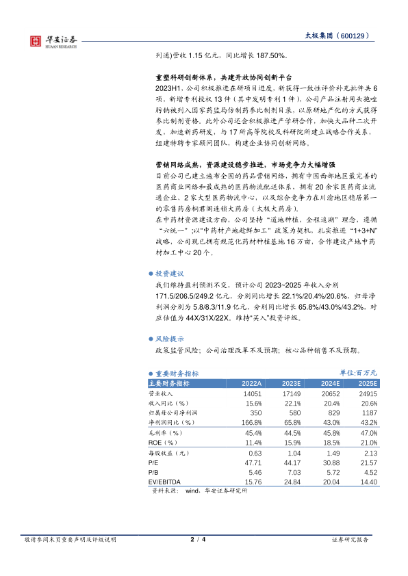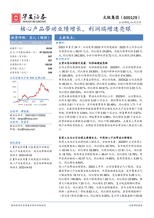 太极集团在2023年上半年取得了显著的业绩增长,这主要得益于其核心产品的强劲销售和医药工业板块的快速发展。公司通过重塑科研创新体系和优化营销网络,不断提升市场竞争力。华安证券维持对太极集团的“买入”投资评级,并看好公司未来的发展前景。
