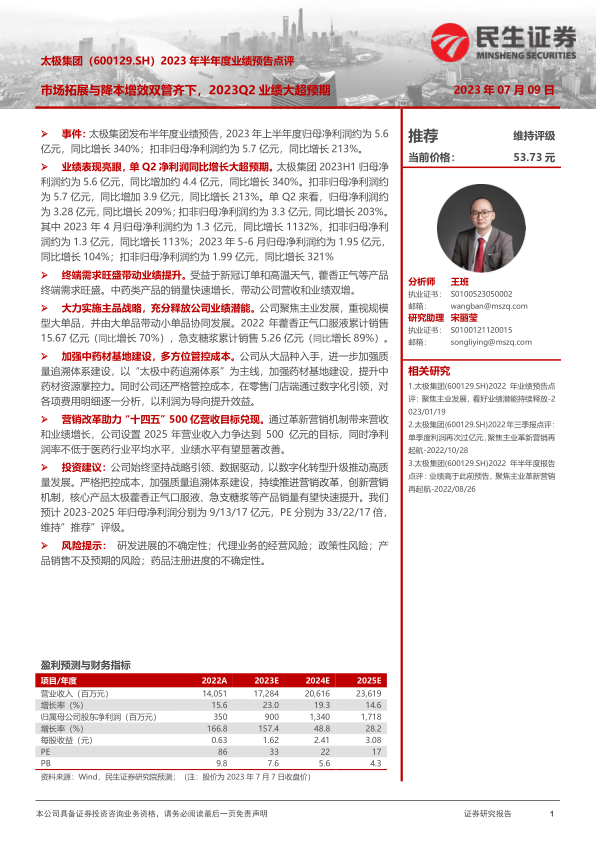 投资建议:公司始终坚持战略引领、数据驱动,以数字化转型升级推动高质量发展。严格把控成本,加强质量追溯体系建设,持续推进营销改革,创新营销机制,核心产品太极藿香正气口服液、急支糖浆等产品销量有望快速提升。我们预计2023-2025年归母净利润分别为9/13/17亿元,PE分别为33/22/17倍,维持”推荐”评级。