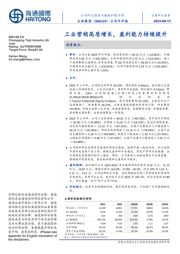 2023年上半年,公司工业实现收入64.01亿元(+40.70%),其中现代中药收入42.40亿元(+55.88%),化药收入21.61亿元(+18.15%)。分治疗领域来看,消化及代谢用药收入21.52亿元(+67.32%),主要产品藿香正气口服液收入18.13亿元(+81.66%);呼吸系统用药收入15.10亿元(+78.45%),主要产品急支糖浆收入5.28亿元(+149.06%),鼻窦炎口服液收入1.30亿元(+27.45%);心脑血管用药收入4.48亿元(+37.35%),主要产品通天口服液收入1.62亿元(+33.88%)。