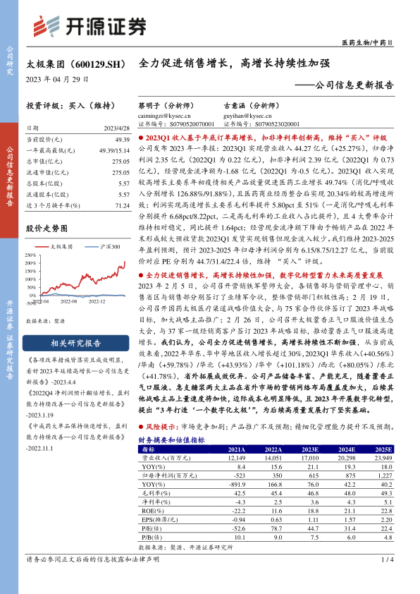 本报告分析了太极集团2023年一季度的业绩表现,指出公司营收和利润均实现显著增长,主要得益于疫情相关产品的放量和医药商业的整合。公司积极推进销售增长策略,省外市场拓展成效显著。维持对公司未来盈利的预测,并维持“买入”评级。同时,报告也提示了市场竞争、产品推广和管理能力提升等方面的风险。