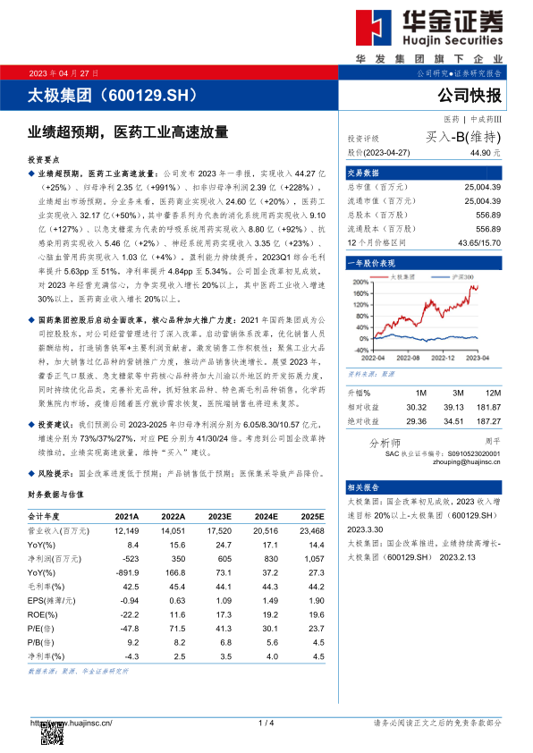 太极集团在2023年第一季度展现出强劲的增长势头,业绩大幅超出市场预期,主要得益于医药工业板块的高速放量,特别是消化系统和呼吸系统核心用药的显著增长。国药集团控股后的全面国企改革,包括营销体系优化和核心品种推广力度的加大,是推动公司业绩提升的关键因素。公司对未来发展充满信心,并设定了积极的年度增长目标。分析师基于公司持续的改革推动和高速放量,维持“买入”评级,并对未来盈利能力持乐观态度,但同时提示了国企改革进度、产品销售及医保集采可能带来的风险。