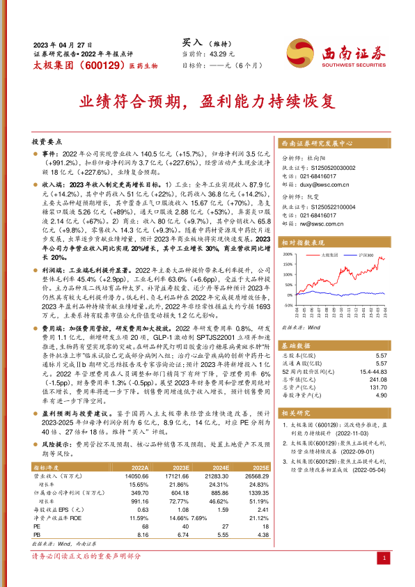 盈利预测与投资建议。鉴于国药入主太极带来经营业绩快速改善,预计2023-2025年归母净利润分别为6亿元,8.9亿元,14亿元,对应PE分别为40倍、27倍和18倍。维持“买入”评级。