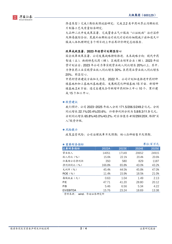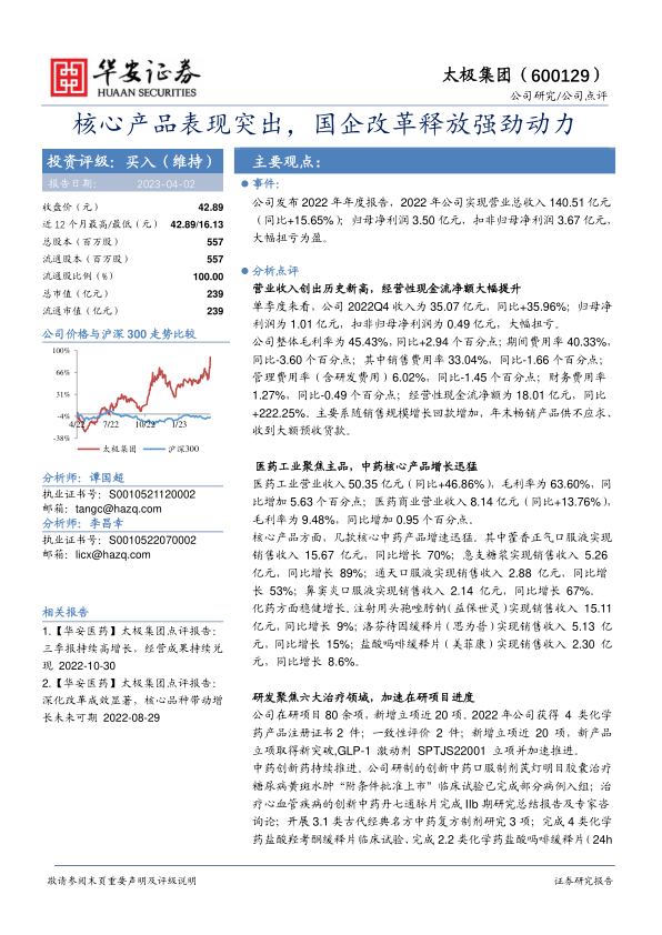 太极集团在2022年凭借核心产品的强劲增长和国企改革的深入推进,实现了营业收入的历史新高和净利润的大幅扭亏。公司医药工业板块,特别是中药核心产品,表现出卓越的市场竞争力。同时,公司在研发创新和中药材资源建设方面持续投入,并制定了积极的2023年经营目标,展现了清晰的战略方向和对未来发展的坚定信心。尽管面临政策监管、改革不及预期和核心品种销售等风险,但基于其稳健的财务表现和增长潜力,本报告维持“买入”的投资评级。