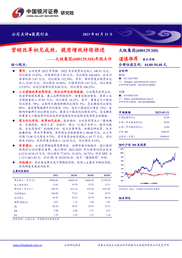 太极集团在2022年通过营销改革和商业优化,实现了业绩的显著增长。国药入主后,协同效应逐步显现,公司盈利能力得到改善。报告预测公司未来三年净利润将保持增长,并给予“谨慎推荐”评级,同时也提示了相关风险。