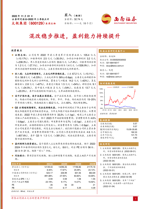 本报告对太极集团2022年三季报进行了点评,分析了公司业绩、收入端、区域扩张等方面的情况,并给出了盈利预测与投资建议。报告认为,太极集团在国药入主后,经营业绩快速改善,盈利能力持续提升,Q3业绩超预期增长,现金流持续改善,维持“买入”评级。