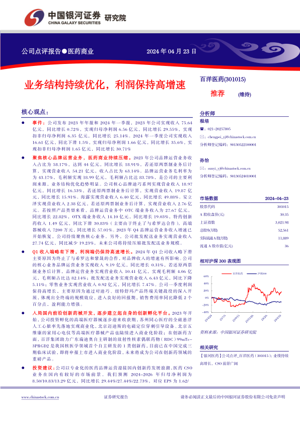 2023年,百洋医药实现收入75.64亿元,同比增长0.72%,归母净利润6.56亿元,同比增长29.55%。2024年一季度,公司实现收入16.61亿元,同比下滑1.5%,归母净利润1.66亿元,同比增长35.6%。
