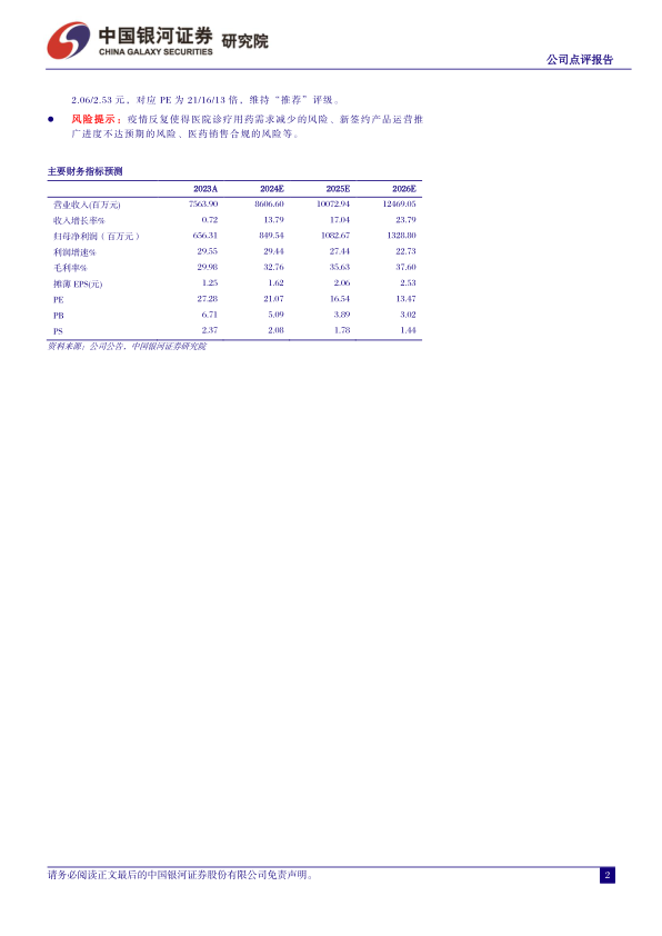 风险提示:疫情反复使得医院诊疗用药需求减少的风险、新签约产品运营推广进度不达预期的风险、医药销售合规的风险等。