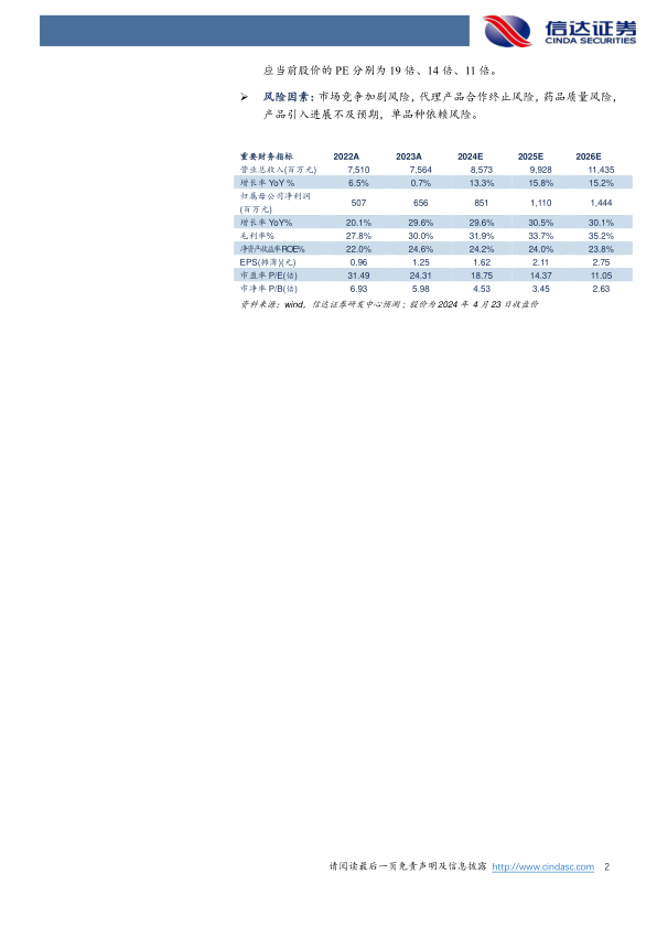 风险因素:市场竞争加剧风险,代理产品合作终止风险,药品质量风险,产品引入进展不及预期,单品种依赖风险。