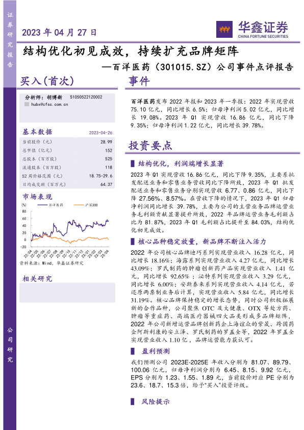 百洋医药2022年报和2023年一季报显示,公司通过优化业务结构,显著提升了利润端表现。同时,公司积极扩充品牌矩阵,为未来增长注入新动力。
