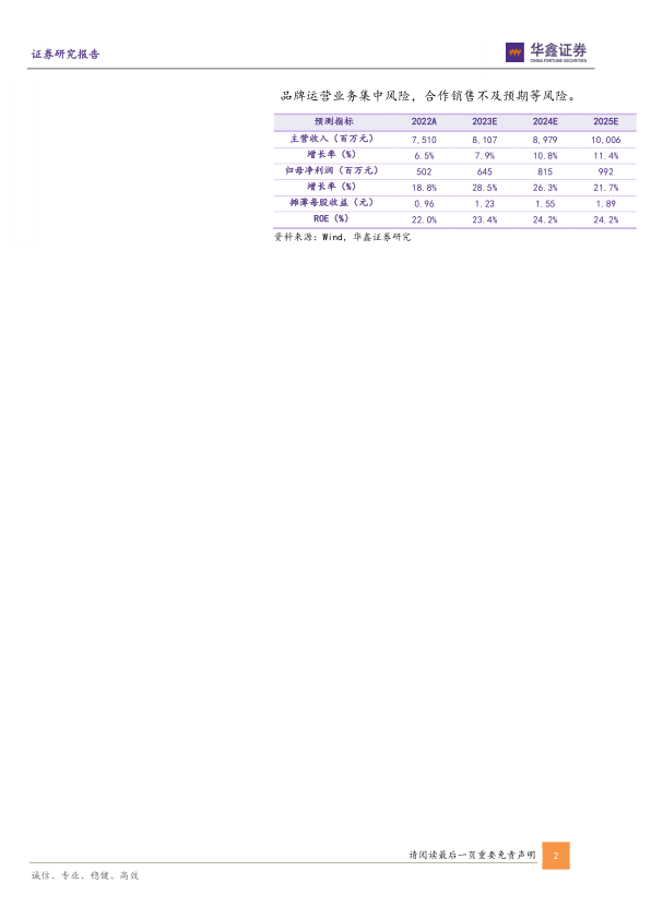 维持“买入”投资评级。需关注品牌运营业务集中风险,合作销售不及预期等风险。