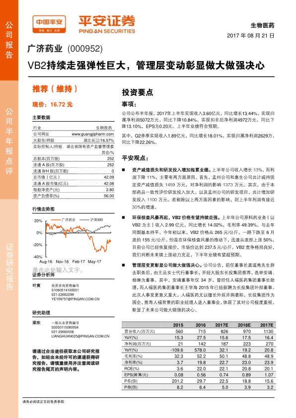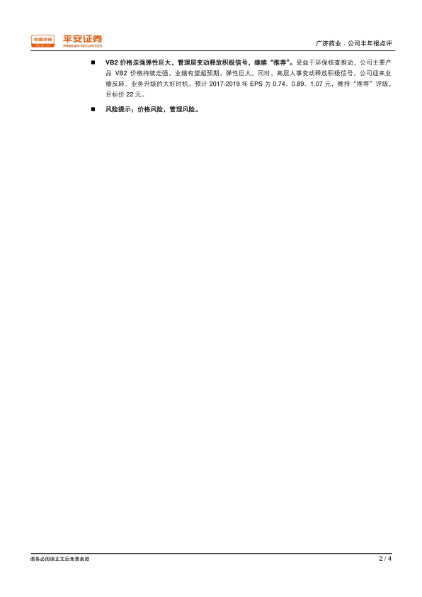 本报告分析了广济药业 2017 年半年报,指出公司业绩受到资产减值损失和研发投入增加的影响,但主要产品 VB2 受益于环保核查价格持续走强,未来业绩有望超预期。同时,管理层变动释放积极信号,彰显了公司做大做强的决心。维持“推荐”评级,目标价 22 元,但需注意价格风险和管理风险。