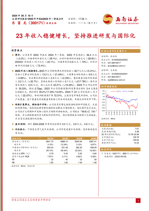 本报告分析了东富龙2023年年报及2024年一季报,指出公司2023年收入稳健增长,但净利润有所下滑,2024年一季度受市场竞争影响,收入和净利润均出现下降。公司坚持推进研发与国际化,实施“M+E+C(AI)”策略,但仍面临国外龙头企业的挑战。报告预计未来几年公司净利润将逐步回升,但需关注下游需求、研发进展及竞争格局等风险。