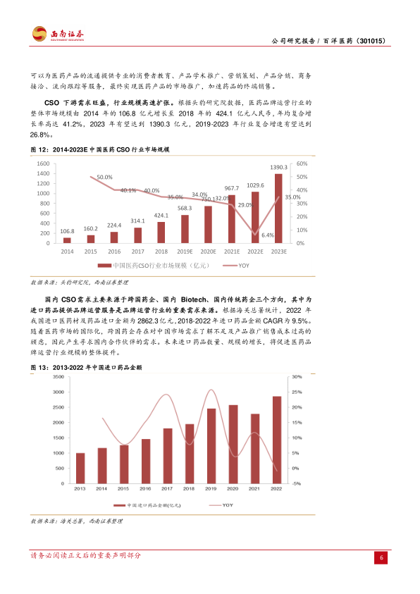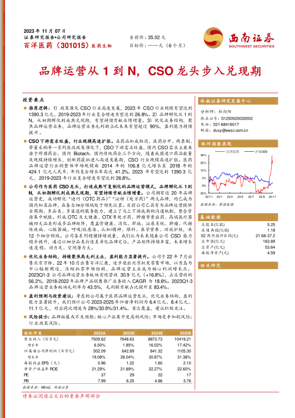 本报告的核心观点在于,百洋医药作为医药CSO(合同销售组织)行业的领先企业,正受益于中国医药改革政策催化下的行业高速发展。预计到2023年,CSO行业规模有望达到1390.3亿元,2019-2023年复合增速高达26.8%。公司凭借近20年的品牌运营经验,成功孵化了“迪巧”和“泌特”等知名品牌,并形成了成熟可复制的品牌运营模式,能够提供全周期、多品类、多渠道的服务能力,从而持续贡献业绩增量。