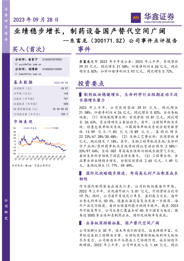 东富龙2023年上半年业绩稳步增长,传统制剂业务表现亮眼,国际化战略持续推进,海外业务盈利能力突出。公司不断拓展业务范围,加大研发投入,提升核心竞争力。首次覆盖,给予“买入”投资评级,但需关注相关风险。