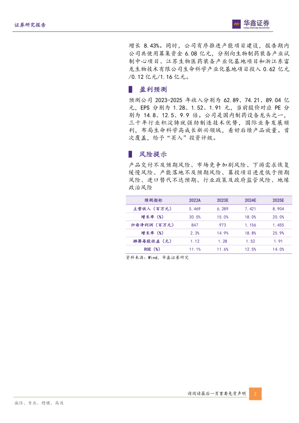 预测公司2023-2025年收入分别为62.89、74.21、89.04亿元,EPS分别为1.28、1.52、1.91元,当前股价对应PE分别为14.8、12.5、9.9倍。公司是国内制药设备龙头之一,三十年行业积淀铸就强劲制造技术优势,国际业务发展顺利,布局生命科学高成长新兴领域,看好后续产品放量。首次覆盖,给予“买入”投资评级。