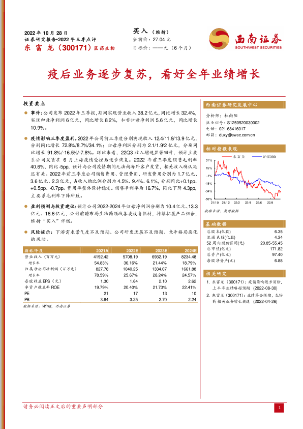本报告对东富龙2022年三季报进行了分析,指出公司业绩受到疫情影响,但整体呈现复苏态势。报告维持对公司的“买入”评级,并预测未来几年公司净利润将持续增长。同时,报告也提示了下游需求、研发进展和竞争格局等方面的风险。