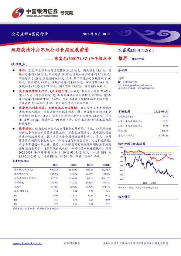 本报告分析了东富龙2022年半年报,指出公司短期业绩受疫情影响,但长期发展前景依然向好。公司作为制药装备龙头企业,受益于行业发展和自身竞争优势,有望持续提升市场占有率和盈利能力。维持“推荐”评级,建议投资者关注。