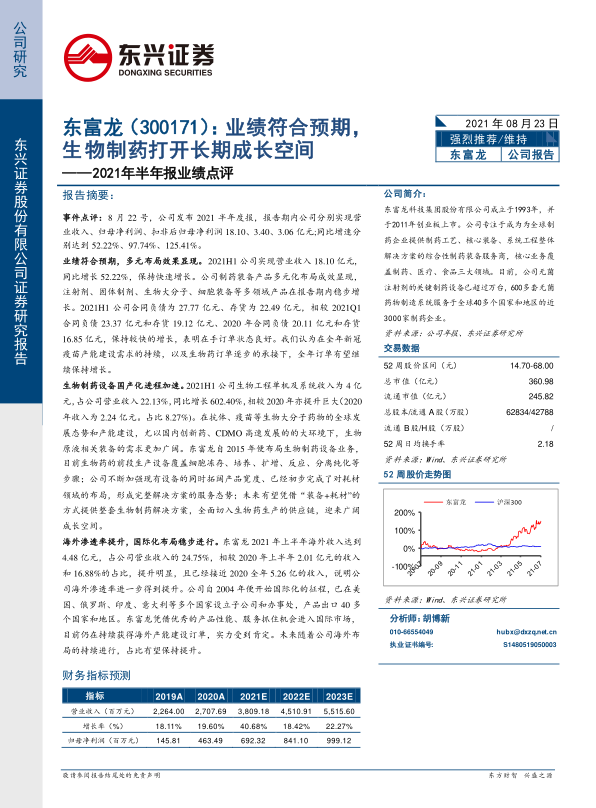 东兴证券的研究报告显示,东富龙2021年半年度业绩符合预期,多元化布局战略初见成效,尤其在生物制药设备国产化和海外市场拓展方面表现突出。公司财务指标预测乐观,维持“强烈推荐”评级,但同时也提示了疫情、政策、海外经营以及国产替代进程等风险因素。