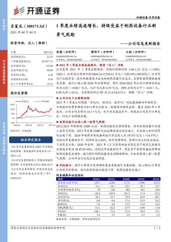 东富龙在2021年一季度展现出强劲的业绩增长势头,归母净利润预计同比增长130%-160%,扣非后归母净利润更是实现249.59%-299.82%的显著增长。作为制药设备行业的领军企业,公司凭借其全面的产品线、卓越的技术实力和优质的服务能力,有望持续保持快速增长。开源证券因此维持“买入”评级,并上调了2020-2022年的业绩预测,预计未来三年归母净利润和每股收益将稳步提升,当前股价对应的市盈率(PE)估值具有吸引力。
