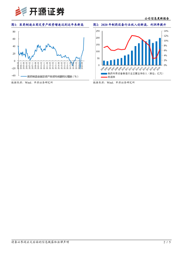 2012-2015年因新版GMP认证,制药设备需求持续增长,国内制药设备行业进入高景气阶段,2015年后因GMP认证高峰结束后需求减少,行业收入和利润率均出现下滑。2020年制药专用设备制造行业总收入为197.87亿元(+14.57%),达到近年来最好水平,利润率为6.44%,回升态势明显,表明行业已经走出低谷。下游需求方面,2020年全年、2021年1-2月医药制造业固定资产投资完成额同比增速分别为28.4%和64%,达到近年来最好水平,固定资产投资旺盛也将带动制药设备需求增加,我们预计制药设备需求将持续释放,行业有望进入新一轮景气周期,公司作为行业龙头受益明显。