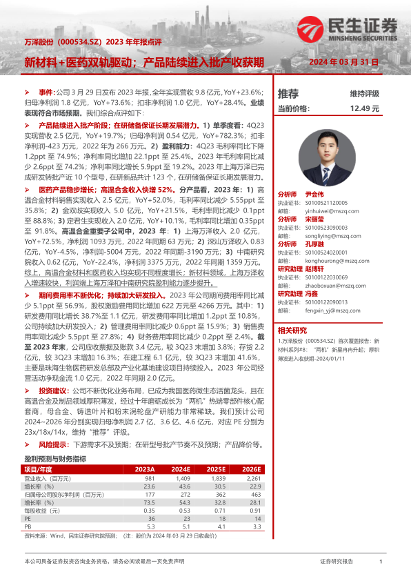万泽股份在2023年表现出良好的增长势头,新材料和医药双轮驱动战略效果显著。公司产品陆续进入批产阶段,研发投入持续加大,盈利能力逐步提升。尽管面临下游需求和产品降价等风险,但基于公司在相关领域的稀缺性和成长潜力,维持“推荐”评级。