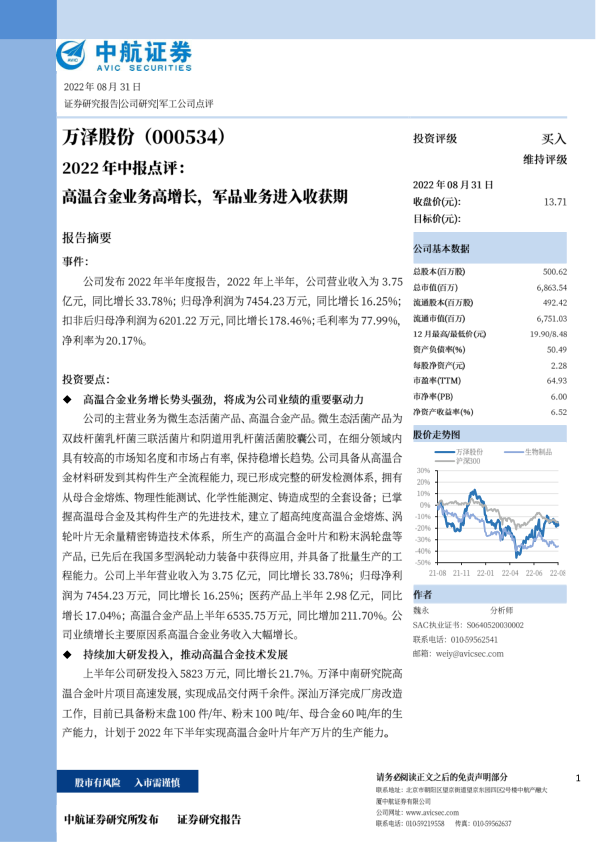 公司的主营业务为微生态活菌产品、高温合金产品。微生态活菌产品为双歧杆菌乳杆菌三联活菌片和阴道用乳杆菌活菌胶囊公司,在细分领域内具有较高的市场知名度和市场占有率,保持稳增长趋势。公司具备从高温合金材料研发到其构件生产全流程能力,现已形成完整的研发检测体系,拥有从母合金熔炼、物理性能测试、化学性能测定、铸造成型的全套设备;已掌握高温母合金及其构件生产的先进技术,建立了超高纯度高温合金熔炼、涡轮叶片无余量精密铸造技术体系,所生产的高温合金叶片和粉末涡轮盘等产品,已先后在我国多型涡轮动力装备中获得应用,并具备了批量生产的工程能力。公司上半年营业收入为3.75亿元,同比增长33.78%;归母净利润为7454.23万元,同比增长16.25%;医药产品上半年2.98亿元,同比增长17.04%;高温合金产品上半年6535.75万元,同比增加211.70%。公司业绩增长主要原因系高温合金业务收入大幅增长。