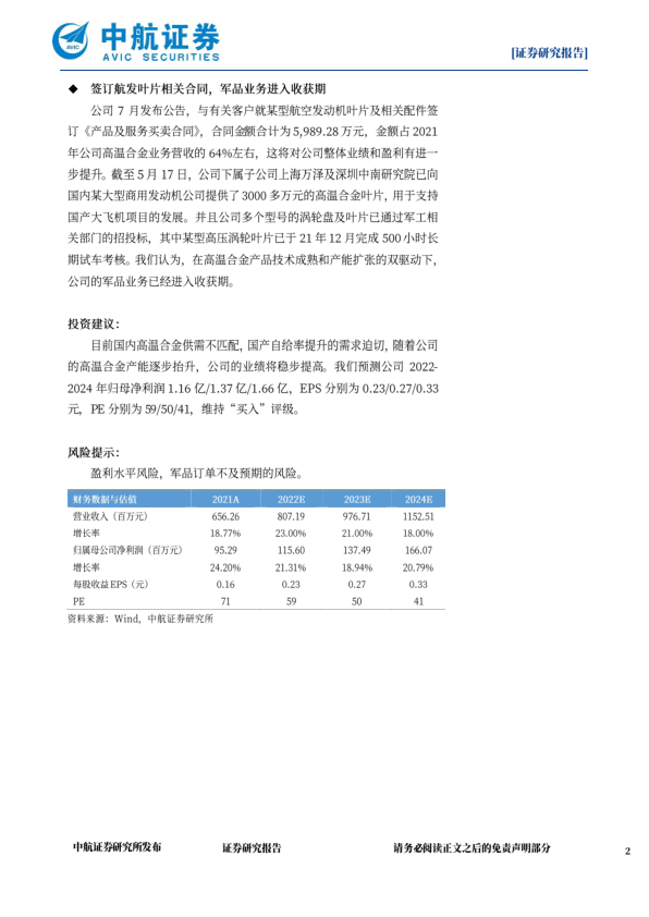 公司7月发布公告,与有关客户就某型航空发动机叶片及相关配件签订《产品及服务买卖合同》,合同金额合计为5,989.28万元,金额占2021年公司高温合金业务营收的64%左右,这将对公司整体业绩和盈利有进一步提升。截至5月17日,公司下属子公司上海万泽及深圳中南研究院已向国内某大型商用发动机公司提供了3000多万元的高温合金叶片,用于支持国产大飞机项目的发展。并且公司多个型号的涡轮盘及叶片已通过军工相关部门的招投标,其中某型高压涡轮叶片已于21年12月完成500小时长期试车考核。我们认为,在高温合金产品技术成熟和产能扩张的双驱动下,公司的军品业务已经进入收获期。