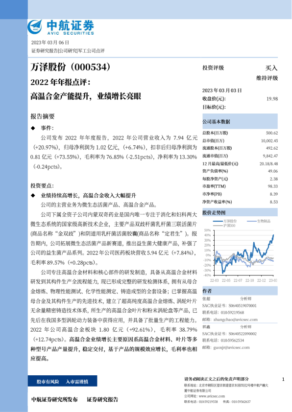 子公司层面,万泽中南研究院基于双性能涡轮盘研制需求,自主研发了第三代粉末合金WZ-A3,主要应用于先进航空发动机的涡轮盘等关键热端部件,未来可以直接转化应用并支撑在研/预研型号发动机研制。2022年实现营收0.80亿元,同比增长236%,净利润0.14亿元,去年同期为-0.17亿元。