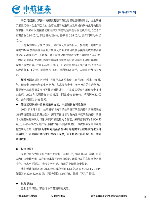 2023年3月4日,公司发布《关于子公司签订某型涡轮叶片框架采协议的的自愿性信息披露公告》,深汕万泽近日与有关客户就某型涡轮叶片签订《框架采购协议》、首批采购产品数量为5台套,采购金额约为1.906.43万元,后续各批次采购产品价格按首批采购清单进行,本次框架采购协议的有效期为五年。我们认为市场对高温合金和叶片的需求正在逐步转化为订单落地,公司高温合金技术已经趋于成熟,未米将会获得更多订单,助力公司成长。