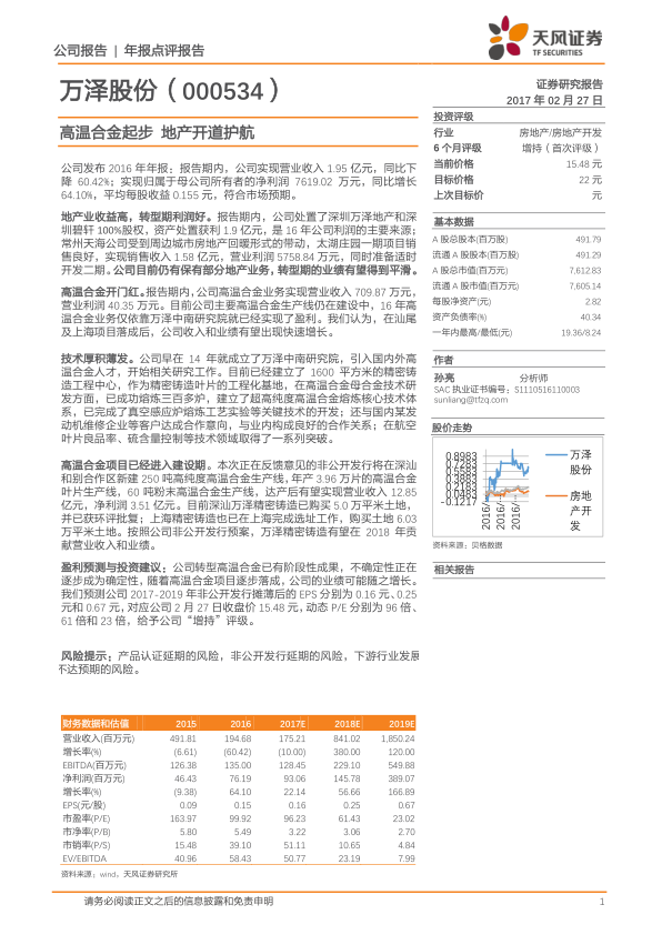 万泽股份在2016年成功实施了业务转型,通过剥离部分房地产资产实现了净利润的显著增长,并为高温合金新材料业务的全面发展奠定了基础。公司在高温合金领域的技术积累深厚,研发成果显著,且生产线建设正有序推进,预计将在2018年开始贡献可观的业绩。尽管转型初期面临营收下降,但高温合金业务的巨大增长潜力使其成为公司未来业绩的核心驱动力。基于对未来业绩的积极预测,公司获得了“增持”评级,但投资者仍需关注产品认证、非公开发行及下游市场发展等潜在风险。