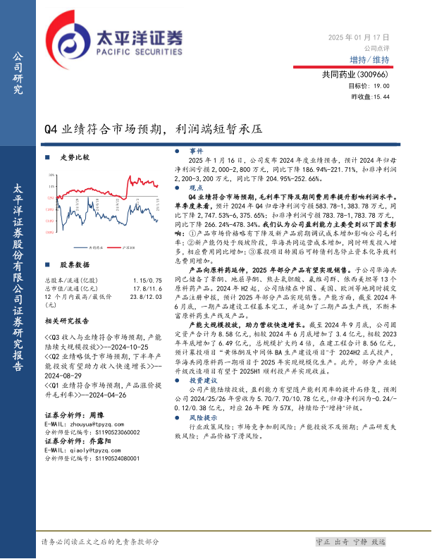 太平洋证券维持共同药业“增持”评级,目标价19.00元。