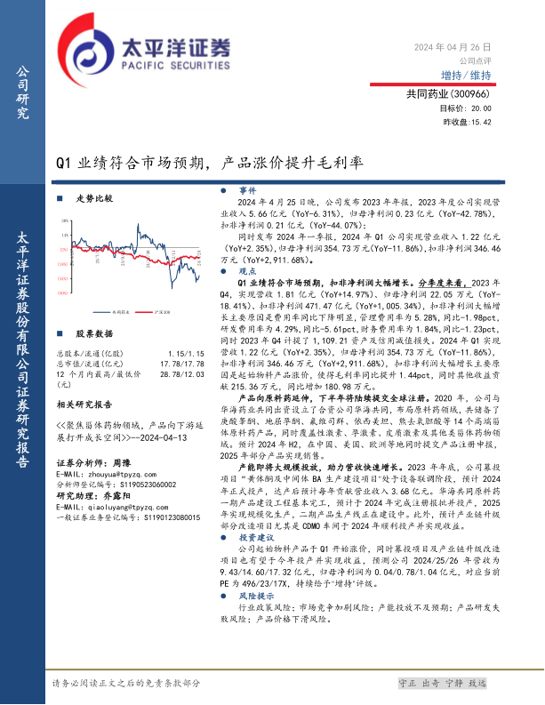 本报告对共同药业的最新业绩进行了分析,认为公司Q1业绩符合预期,扣非净利润大幅增长,产品涨价提升毛利率。公司积极布局原料药领域,产能即将大规模投放,有望助力营收快速增长。维持“增持”评级,但同时也提示了相关风险。