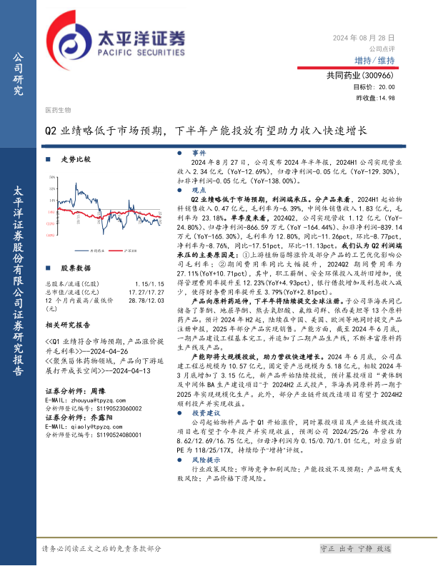 共同药业短期业绩受到多重因素影响,Q2业绩略低于市场预期。但公司积极拓展产品线,向原料药延伸,并大力投入产能建设,为未来增长奠定基础。预计随着新产品陆续上市和产能逐步释放,公司营收和利润将迎来快速增长。维持“增持”评级,看好公司长期发展前景。