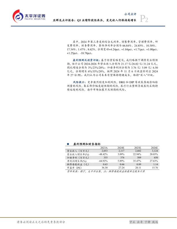 尽管短期业绩承压,但公司仪器装机量持续快速增长,特别是流水线业务表现亮眼,为未来试剂销售奠定坚实基础。产品结构优化使得综合毛利率显著提升。基于对公司未来稳健成长的预期,太平洋证券维持亚辉龙“买入”评级,并略微下调了2024-2026年的业绩预测,预计归母净利润将分别增长6%、35%和28%,对应2024年27倍PE,认为公司具备长期投资价值。
