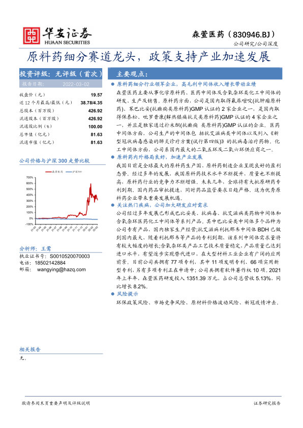 森萱医药凭借其在原料药细分领域的深厚积累、多元化的产品布局、国际化的认证体系以及持续增长的业绩,确立了行业领军地位。公司通过产业链整合提升了运营效率和盈利能力,并积极响应国家政策导向,在特色原料药和锂电池新材料等领域抓住市场机遇。面对热门疾病的治疗需求,公司持续加大研发投入,构建了坚实的专利壁垒,展现出强大的创新能力和市场竞争力。尽管面临环保政策、市场竞争、原材料价格波动及新冠疫情等风险,森萱医药凭借其稳健的战略布局和持续的研发创新,有望在未来医药及新材料市场中实现可持续发展。