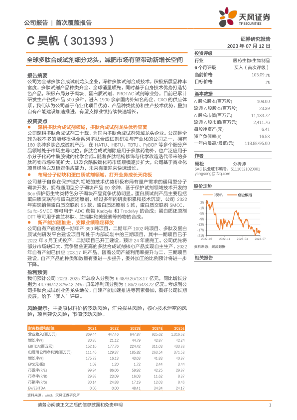 我们预计公司2023-2025年总收入分别为6.48/9.26/13.17亿元,同比增长分别为44.79%/42.87%/42.24%;归母净利润分别为1.86/2.64/3.72亿元。考虑到公司多肽合成试剂业务龙头地位,自建产能加速推进等因素叠加,看好公司长期发展,给予“买入”评级。