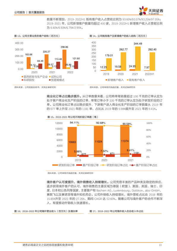 公司为全球多肽合成试剂龙头企业,深耕多肽试剂合成技术,积极拓展品种丰富度,多肽试剂产品种类齐全、全球销量领先,同时基于自身技术优势打造特色产品,积极布局分子砌块、蛋白质试剂、PROTAC试剂等业务,目前已累计研发生产各类产品500多种,进入1900余家国内外知名药企、CXO的供应体系。我们认为公司基于商业化项目优势、产品种类优势和生产技术优势,叠加自有产能建设加速推进,有望支撑业绩持续快速增长。