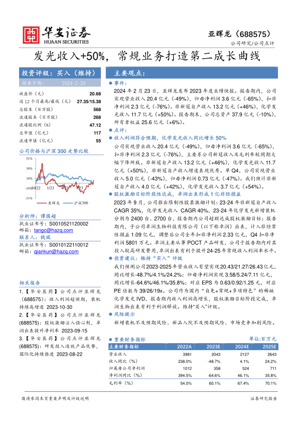 2023年9月,公司推出限制性股票激励计划:23-24年非新冠自产收入CAGR35%,化学发光收入CAGR40%,23-24年化学发光新增装机分别为2400台、2700台,报告期内公司超额达成股权激励目标;报告期内,子公司卓润生物科技有限公司(以下称卓润)出表,计入非经常性损益1.09亿元,调整后公司全年扣非净利润2.33亿元,Q4扣非净利润5801万元。卓润主要从事POCT产品研发,公司于报告期内对其投入较高研发费用,卓润出表有利于提升24-25年常规收入利润率水平。