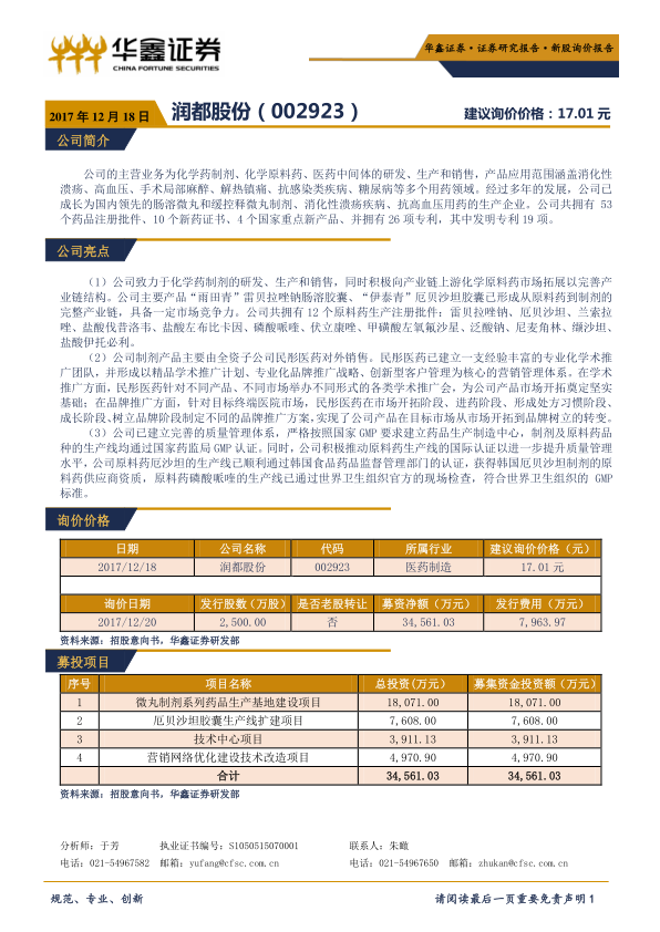 本报告对润都股份(002923)进行了新股询价分析,建议询价价格为17.01元。报告突出了公司在化学药制剂、化学原料药及医药中间体领域的优势,尤其是在产业链整合、市场推广和质量管理方面的亮点。募投项目将进一步提升公司的生产能力和技术水平。