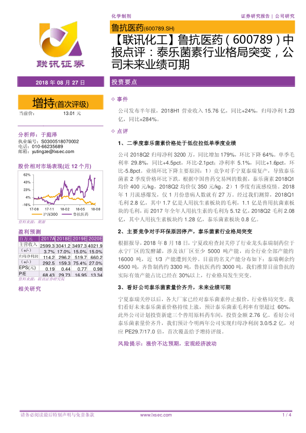 【联讯化工】鲁抗医药中报点评:泰乐菌素行业格局突变,公司未来业绩可期
