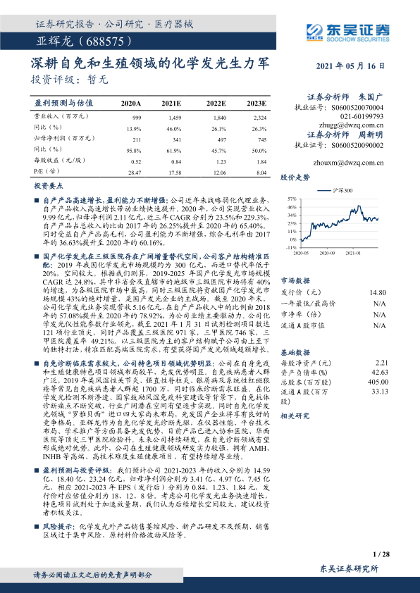 盈利预测与投资评级:我们预计公司2021-2023年的收入分别为14.59亿、18.40亿、23.24亿元,归母净利润分别为3.41亿、4.97亿、7.45亿元,相应2021-2023年EPS(发行后)分别为0.84、1.23、1.84元,发行价对应估值分别为18、12、8倍。考虑公司化学发光业务快速增长,特色项目试剂处于加速放量期,我们认为后续增长空间较大,建议投资者积极关注。