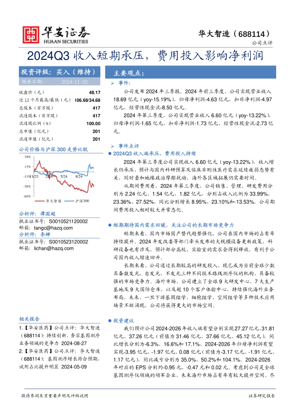 本报告对华大智造进行了公司点评,指出公司2024年Q3收入短期承压,但长期市场竞争力依然强劲。报告分析了公司业绩、经营情况、投资建议和风险提示,并提供了详细的财务数据和报表。维持“买入”评级,但提醒投资者关注市场竞争和地缘政治风险。