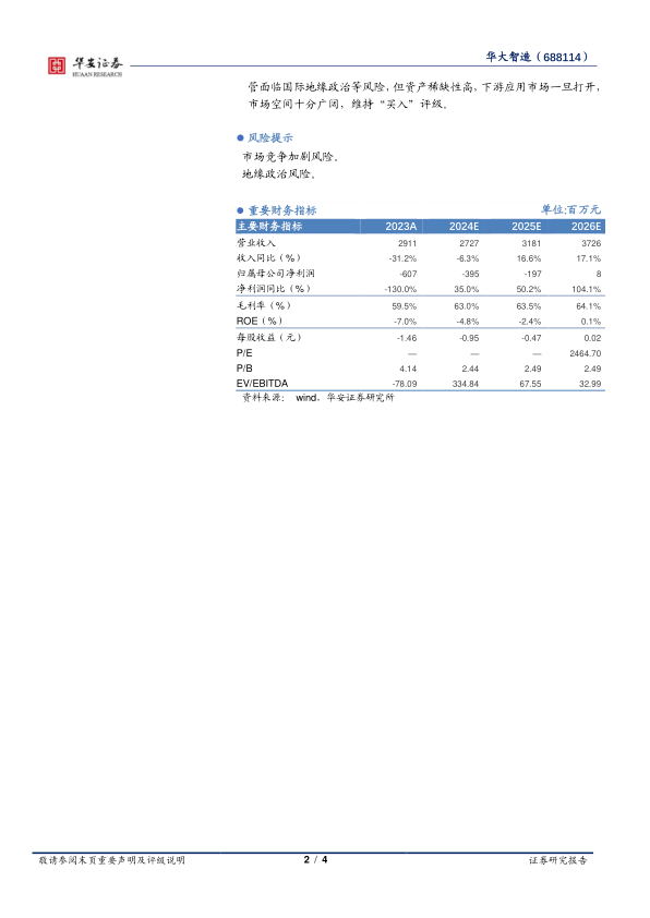 我们预计公司2024-2026年收入端有望分别实现27.27亿元、31.81亿元、37.26亿元(前值为31.46亿元、37.66亿元、45.12亿元),同比增长分别为-6.3%、16.6%和17.1%,2024-2026年归母净利润有望实现-3.95亿元、-1.97亿元、0.08亿元(前值为-3.17亿元、-1.91亿元、1.17亿元),同比减亏分别为35.0%、50.2%和104.1%。2024-2026年对应的EPS分别约-0.95元、-0.47元和0.02元。考虑到公司是全球基因测序仪领域的领军企业,未来海外市场占有率有较大提升空间,尽管面临国际地缘政治等风险,但资产稀缺性高,下游应用市场一旦打开,市场空间十分广阔,维持“买入”评级。