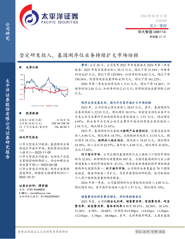 华大智造在2023年面临营收和利润下滑的挑战,但基因测序仪业务表现亮眼,国内外市场份额持续扩大。公司加大研发投入和市场拓展力度,虽然短期内影响盈利能力,但长期来看有助于提升竞争力。太平洋证券维持对华大智造的“买入”评级,并对其未来发展持乐观态度。