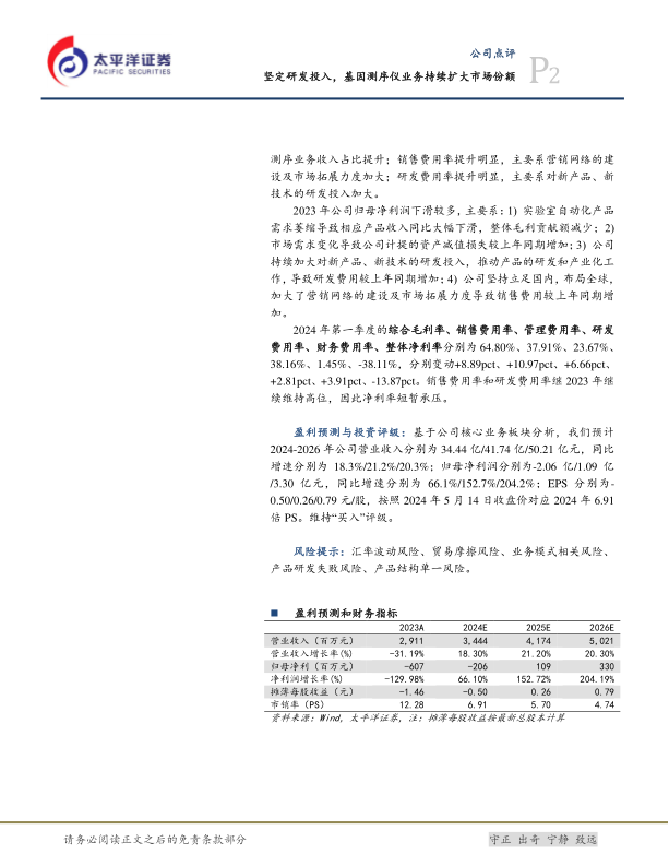 2023年度,公司的综合毛利率、销售费用率、管理费用率、研发费用率、财务费用率、整体净利率分别为59.47%、28.58%、18.14%、31.26%、-4.78%、-20.86%,分别变动+5.89pct、+14.01pct、+3.84pct、+12.01pct、-1.19pct、-68.68pct。其中,毛利率提升明显,主要系基因测序业务收入占比提升;销售费用率提升明显,主要系营销网络的建设及市场拓展力度加大;研发费用率提升明显,主要系对新产品、新技术的研发投入加大。