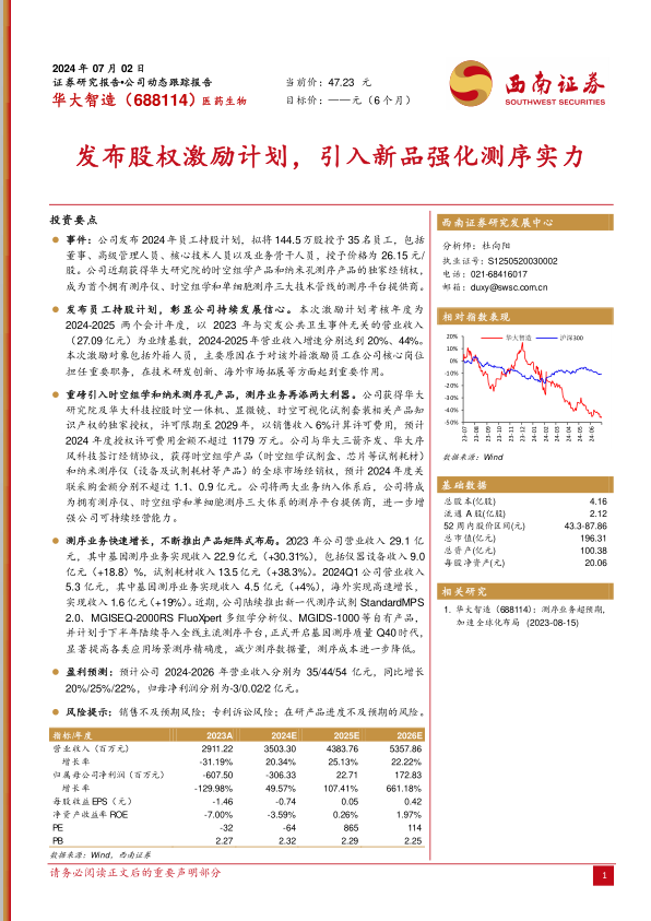 事件:公司发布2024年员工持股计划,拟将144.5万股授予35名员工,包括董事、高级管理人员、核心技术人员以及业务骨干人员,授予价格为26.15元/股。公司近期获得华大研究院的时空组学产品和纳米孔测序产品的独家经销权,成为首个拥有测序仪、时空组学和单细胞测序三大技术管线的测序平台提供商。