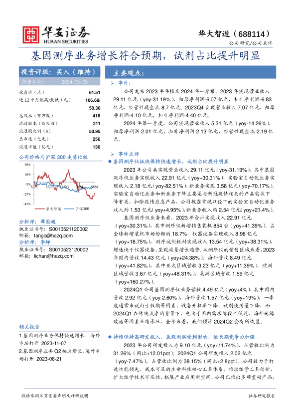 本报告分析了华大智造2023年年报及2024年一季报,指出公司基因测序业务保持增长,试剂占比提升明显。公司持续投入研发,推出多项创新产品,长期竞争力有望加强。报告预测了公司未来三年的收入和利润,并维持“买入”评级,但同时也提示了新产品研发风险、市场竞争风险和地缘政治风险。