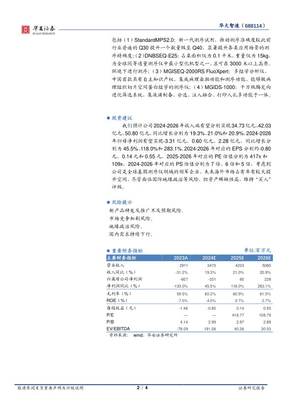 我们预计公司2024-2026年收入端有望分别实现34.73亿元、42.03亿元、50.80亿元,同比增长分别为19.3%、21.0%和20.9%,2024-2026年归母净利润有望实现-3.31亿元、0.60亿元、2.28亿元,同比增长分别为45.5%、118.0%和283.1%。2024-2026年对应的EPS分别约-0.80元、0.14元和0.55元,2025-2026年对应的PE估值分别为417x和109x,2024-2026年对应的PS估值分别为7倍、6倍和5倍,考虑到公司是全球基因测序仪领域的领军企业,未来海外市场占有率有较大提升空间,尽管面临国际地缘政治等风险,但资产稀缺性高,维持“买入”评级。